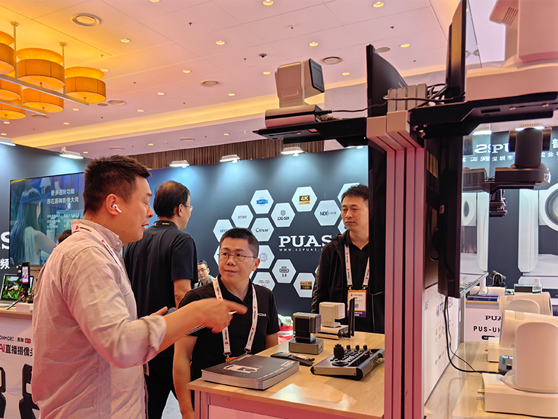 普奥视展位前人潮涌动,围满了前来咨询的参会人员。PUS-UHD800系列Ai+智能广播级云台摄像机的AI自动追踪功能首次亮相和演示,收到大家浓厚的兴趣。PUS-UHD700系列无线摄像机以其超高颜值和无线功能备受关注,PUS-MKB10迷你控制键盘也因其小巧设计、人体工学按键布局设计以及按键的触摸舒适度备受喜爱。