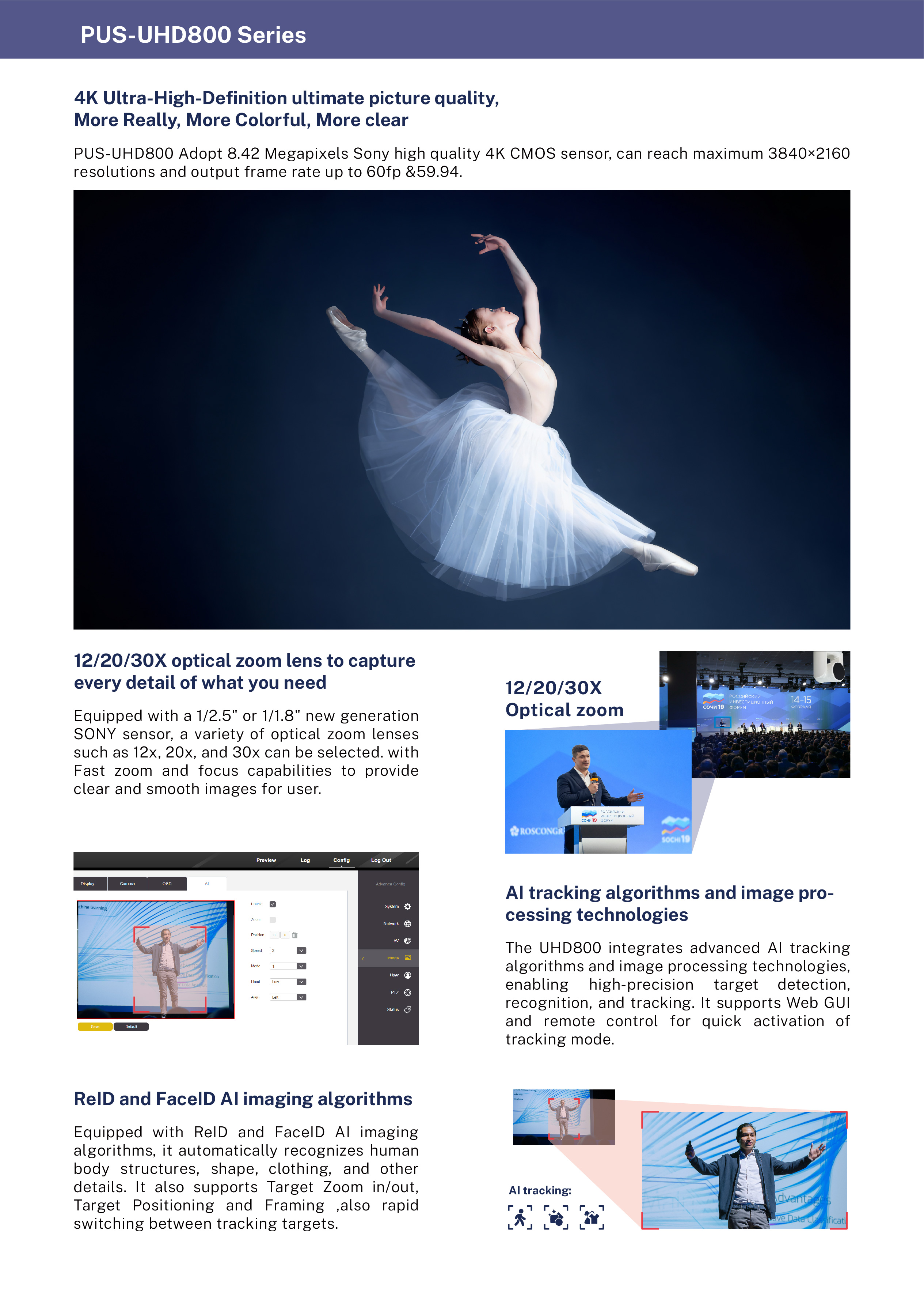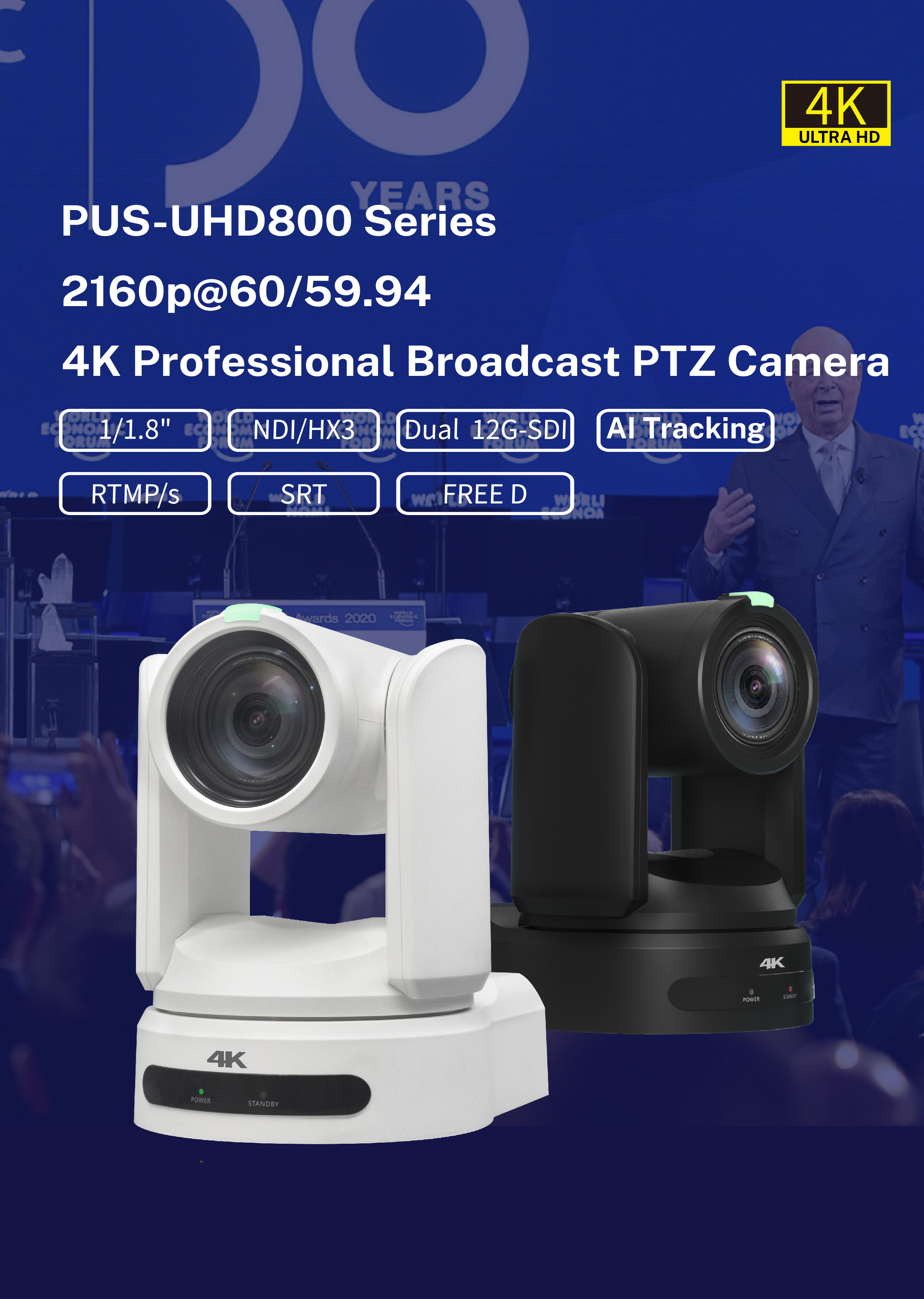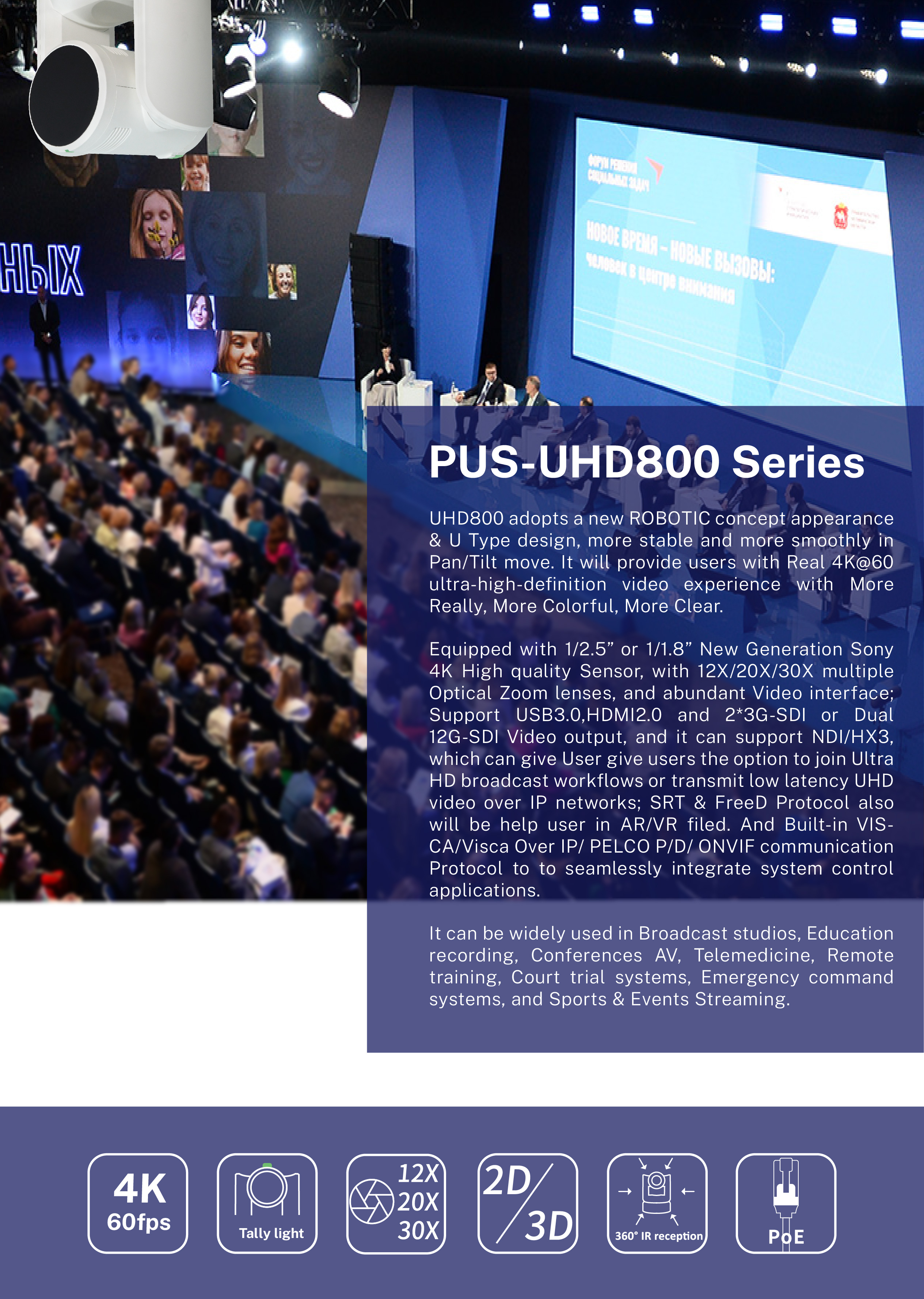 The PUAS PUS-UHD800 Series is a 4K Ultra HD broadcast-grade PTZ camera, engineered with integrated NDI® 5.0 technology and full support for the latest NDI®|HX3 protocol. It is available with 12x, 20x, or 30x optical zoom lenses to meet diverse production requirements.