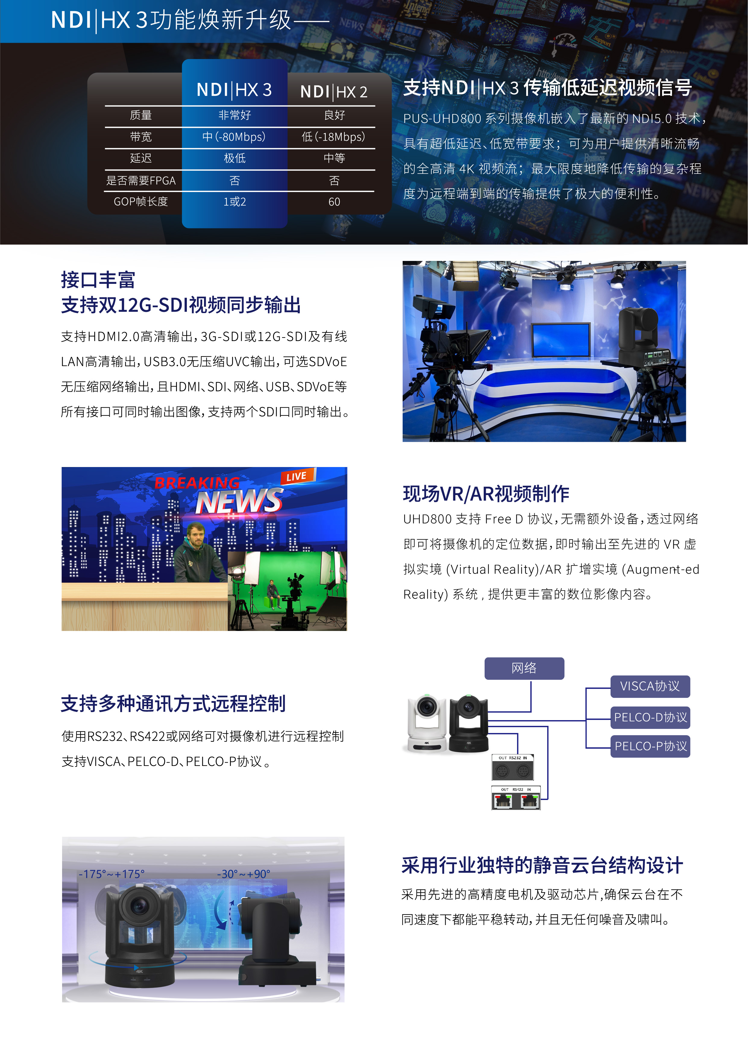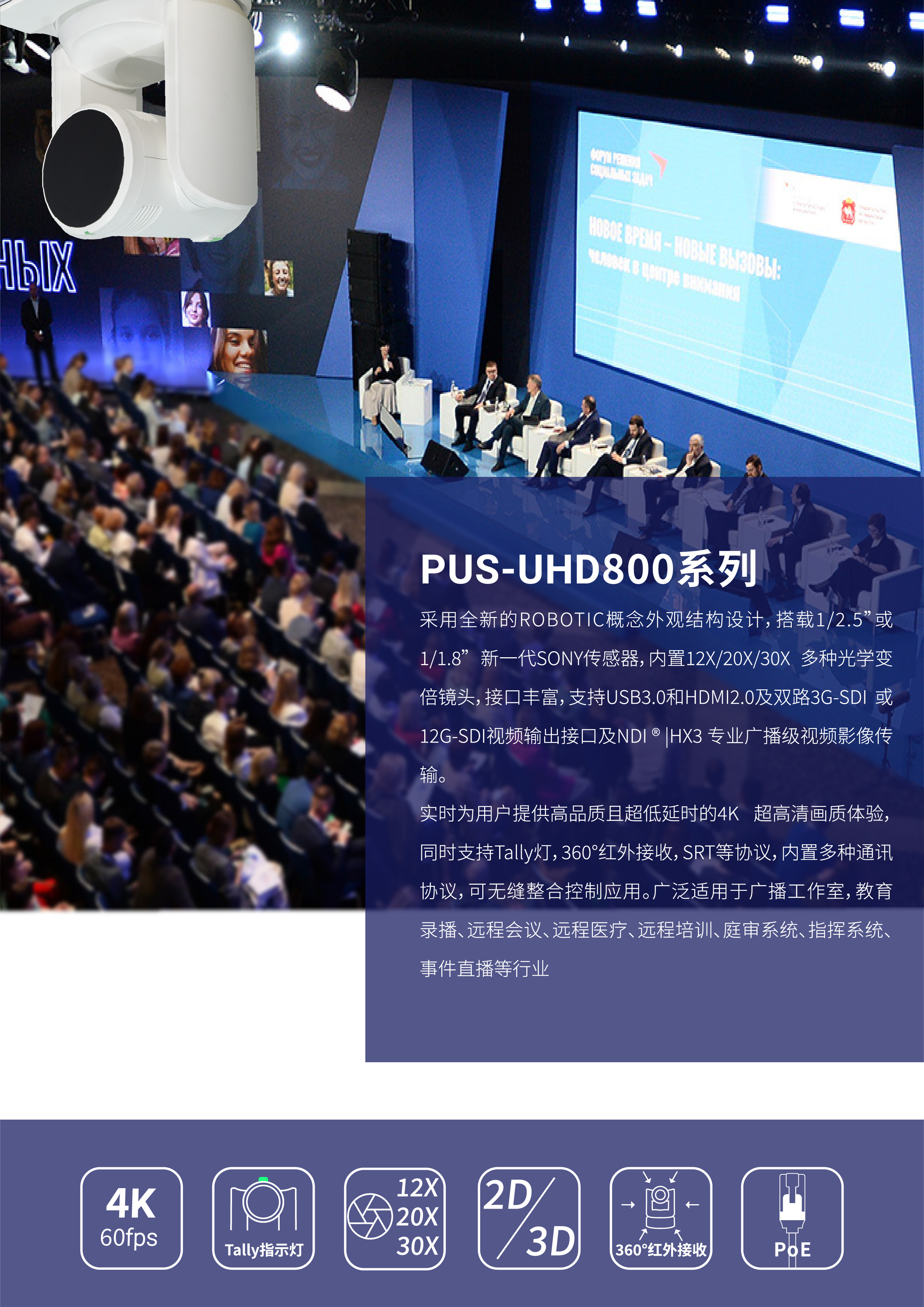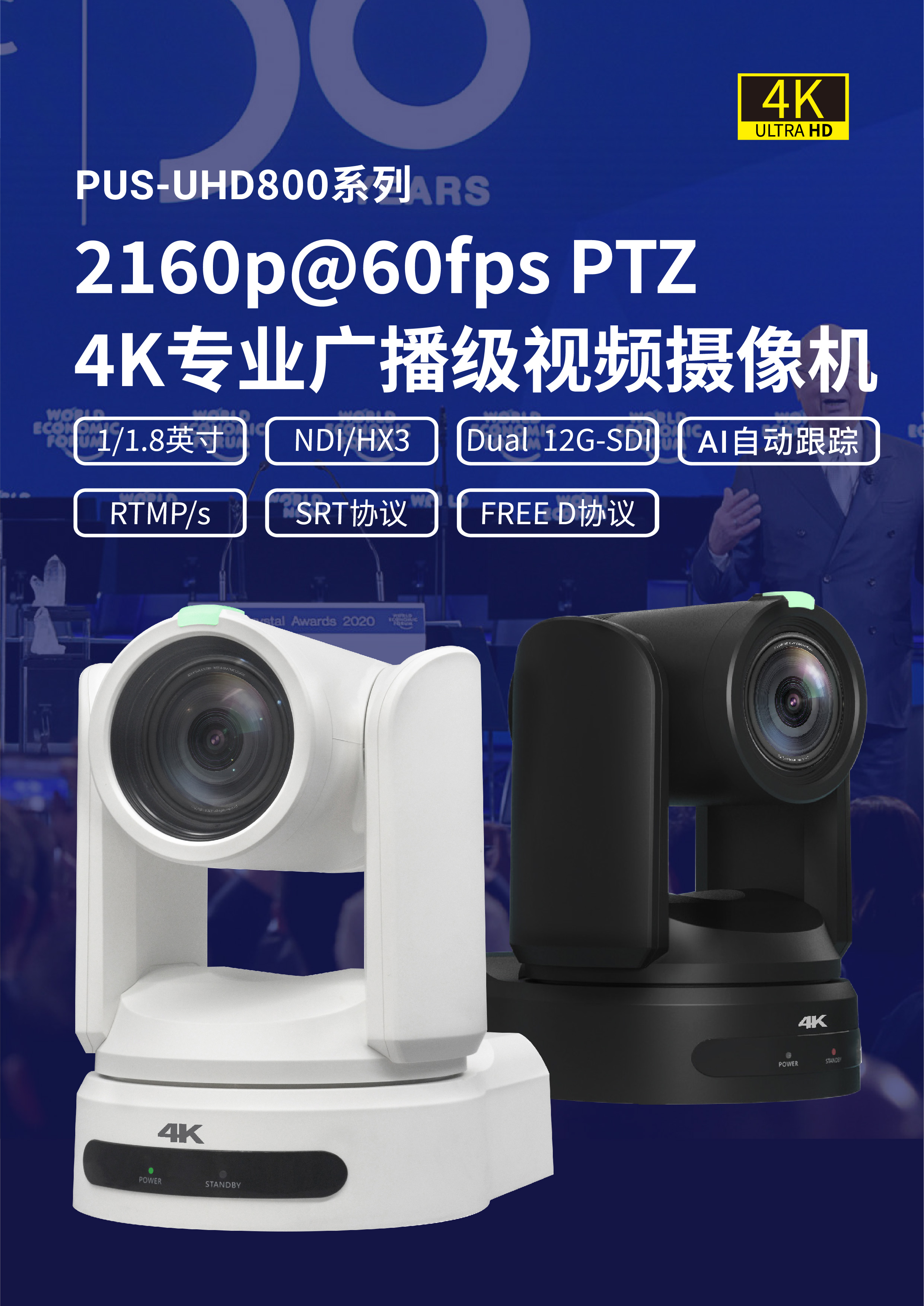 PUS-HD300BN是NDI系列高端高清视频云台摄像机,嵌入最新的NDI5.0技术,配备10X/20X/30X光学变焦镜头,支持广播视频输出格式59.94 & 29.97fps;首创OLED触控显示面板设计;支持4路同时视频输出USB2.0、HDMI、3G-SDI、IP(RTSP/RTMP...