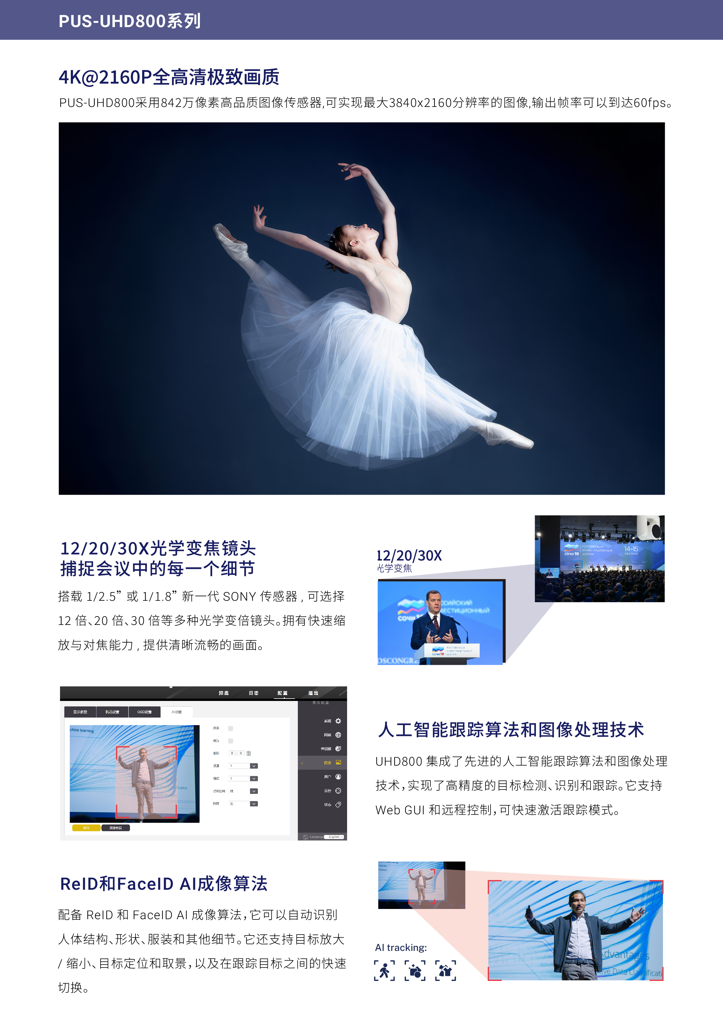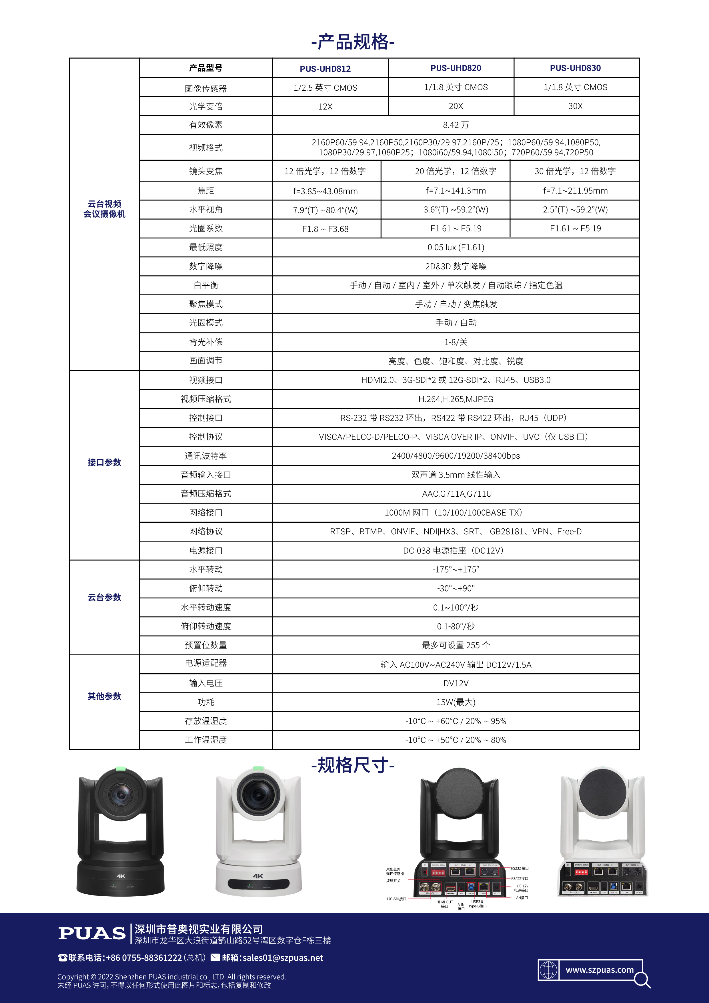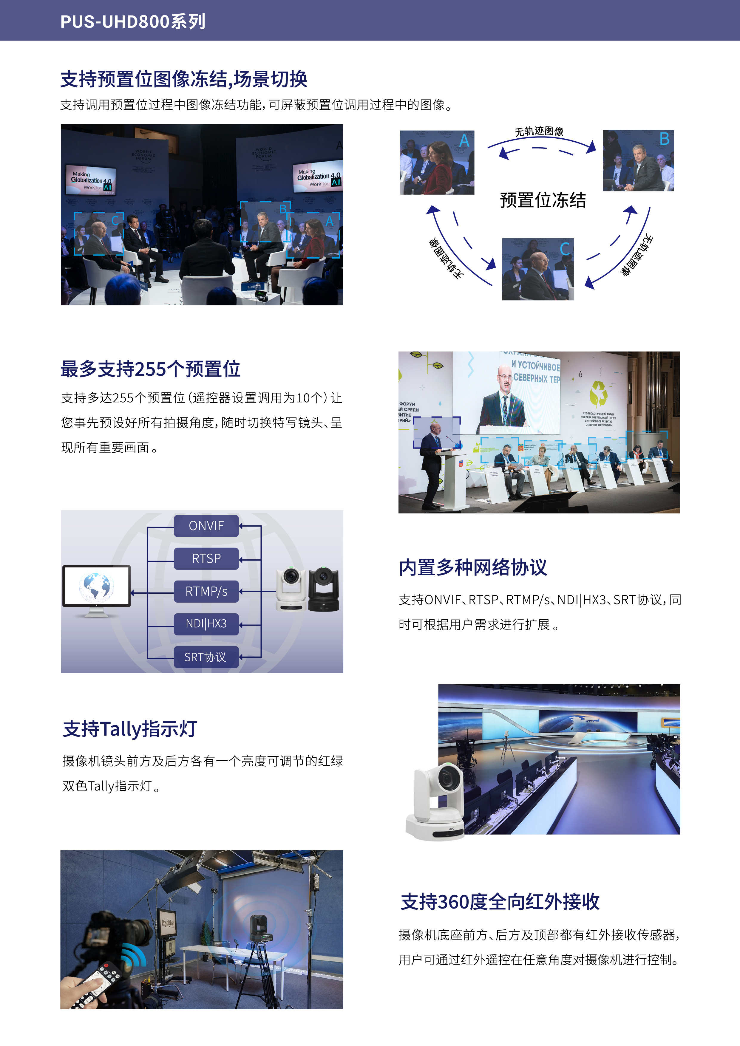 PUS-HD300BN是NDI系列高端高清视频云台摄像机,嵌入最新的NDI5.0技术,配备10X/20X/30X光学变焦镜头,支持广播视频输出格式59.94 & 29.97fps;首创OLED触控显示面板设计;支持4路同时视频输出USB2.0、HDMI、3G-SDI、IP(RTSP/RTMP...
